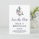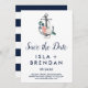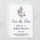 Den här blommigtens ankarsommar sparar du datumkortet som perfekt för ett nautiskt tema bröllop. Utformningen har en vacker bukett av rosa och vita sommarblommor som är inslagna runt en vattenfärgsbåtankare.