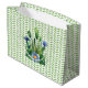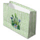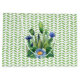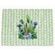 Den här designen har en blandning av grafiska former och färgstarka blommor. Bakgrunden är mönster i grönt löv. I mitten av designen finns en gruppering av blåblommor och orangar. Denna generiska utformning är perfekt för Påsk, Mors dag, födelsedagar, möhippor och så många fler festliga tillfälle.