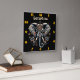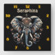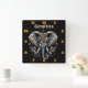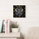 En svårbegripligt designad elefant står i stort, försedd med vackra blommönster. Det mjuka ljuset från gryningen förstärker dess elegans, symboliserar styrka och skönhet i naturen.