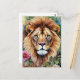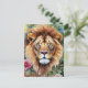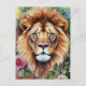 Vattenfärgsgrafik med vykort har en lejon kung i djungeln, i en botanisk inställning med blomaccenter. Det våldsamma kattdjuret går framåt i ett porträtt där naturens makt och skönhet framhävs. Underbar för stora kattlejon älskare och zodiakleos!