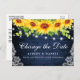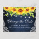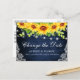 Modern Elegant Watercolor Solros Blommigt och Greenery Ändra postkortets datum Bröllop innehåller solblommor och grönt på rundblått trä med strängen ljus och snöre.