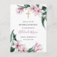 Ett vykort för elegant med dubbla baptism och första födelsedagsevenemang. Inbjudan till blommigten söt innehåller känsliga löv för rosa och mjuk grönt. Vattenfärgens blommigt utformar ramar a guld kor och händelseinformationen. På baksidan kan du lägga till händelseplatser, OSA och födelsedagsfest.