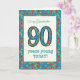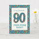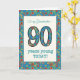 Ett ålderspecifikt födelsedagskort för en 90-årig mormor, med nummer 90 och gräns fyllt med ett färgstarkt blommönster på tealbakgrund. Blommönstret är en del av "Granny Print"-samlingen Posh & Painterly, från en handmålad papper kollage av Judy Adamson. Den här designen passar alla storlekar på gratulationskort.