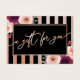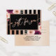 Konstruktionen har blommor och rosa över grönt löv, en svart rektangel som skisseras i en dubbla ro guld ram och en svart och ro glitter strimlad bakgrund. Baksidan av presentkortet har en enkel bakgrund i ro guld.