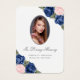 Vacker blått och rosa blommigt minneskort/begravningserbjudande med ett foto med vattenfärg rosa och blått ro och baby utandningsblommor på en vit bakgrund.