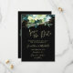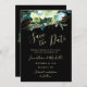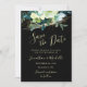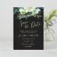 Elegant bröllop sparar datumet med en blommigt vattenfärgsdesign med vackra blå, vita och elfenbensblommor som accentueras med stänk i guld, turkos löv och svart bakgrund.