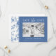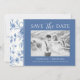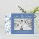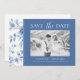 Det här förfinade blått och vitt fotot "Spara datum"-kortet visar en elegant med leksaksininspirerad blommigt gräns och ett skarpt, minimalistiskt center för dina bröllop-detaljer. Ett snyggt balanserat typografiskt par är ett snyggt skript med klassiskt serif-tecken för en tidslängd, romantisk känsla. Anpassade med foton, namn, datum, plats och webbplats för bröllop är den här designen perfekt för att presentera firande med stil. Ett idealiskt val för traditionell bröllop, trädgård eller kustnära, som ger perfekten det första intrycket för din speciella dag.