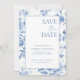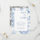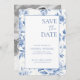 Det här förfinade blåvita och vita "Spara datum"-kortet visar en elegant-leksaksinspirerad blommigt gräns och ett skarpt, minimalistiskt center för dina bröllop-detaljer. Ett snyggt balanserat typografiskt par är ett snyggt skript med klassiskt serif-tecken för en tidslängd, romantisk känsla. Anpassade med foton, namn, datum, plats och webbplats för bröllop är den här designen perfekt för att presentera firande med stil. Ett idealiskt val för traditionell bröllop, trädgård eller kustnära, som ger perfekten det första intrycket för din speciella dag.