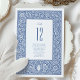 Lägg till en liten elegans i din bröllop-dekoration med det här William Morris-inspirerade bordsnumret-kortet. Detta kort har en komplicerad blommigt och vindruv mönster i klassiskt blått och vitt och ger en sofistikerad ambians i vintage till alla mottagningar. Bordsnumrets vackert detaljerade gräns ramar skapar en bedövande kontaktpunkt för varje bord. Perfekt för vintage eller traditionellt bröllop, det här bordsnumret kombinerar sömlöst historisk konst med modern funktionalitet och skapar det som ett minnesvärt tillägg till din bröllop-dekoration.