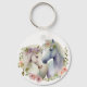 Den här nyckelkedjan har en vacker boho stil-målning av två vita hästar som dekoreras med rosa- och lavendelblommor. En motsvarande blommigt-andedräkt omger dem. Baksidan har er text i två fält.