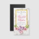 En bröllop spara datum-uppsättning magnetkort. Med en modern design - en faux marble struktur i vitt utgör bakgrunden. Överst är en ram med faux guld-folie gräns. Storfärgade rosa- och lila vattenfärgstygnblommor med grönt bläckstråleaccenter dekorerar designen. Anpassa med din bröllop-information.