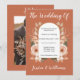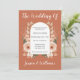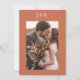 Det trendande temat Rust Bröllop är här! Den här utformningen har en terracotta-bakgrund med kalligrafiskt skript och foto av det gifta paret. Den har en blommigt i orangen framtill och ett foto baktill. Anpassa enkelt bröllopsinbjudan genom att klicka på att anpassa det och fylla i information och foton om bröllop.