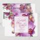 Orchds ger en prydnadsbakgrund för dessa sparar datuminbjudningskorten. Underbar för varma väderhändelser, bröllop, årsdagar, utomhus, inomhus. Använda för att komplettera blommigt bröllop, inklusive tropiska teman. Lägg enkelt till fyra av dina favoritfoton på baksidan. En QR-kod tillhandahålls också för en bröllop webbplats, bröllop-register med mera. Använda mallen som ska anpassas.