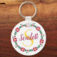 Cute blommigt monogrammad nyckelring med namn. Utandning av söt som består av färgad av enkel magenta blommar ramar anpassningsbarna i formgivningen. Den del av designen som du kan anpassa består av ett monogram för gulten som finns i bakgrunden och ett kursivt skript för lila namn i förgrunden. Den elegans som kalligrafi-stil-bokstäver och rena minimalistiska utseendet av blommornas kom tillsammans ger en vacker snyggt. Gör en underbar, prisvärd personlig till henne.