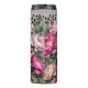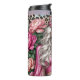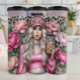En slående figur med ett långt, flytande platinumblondinskt hår och piercing blå ögon innehåller ett jakkaffe. Hon bär en rosa basebollhatt med blommor, en passande rosa och blå jeans. Lush rosa folk omger henne, sätter sig mot en texturerad bakgrund med en subtil leopard print av mönster.