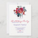 Blommigt feminin-födelsedagsfest inbjudan-mall med en vacker ro bukett av rött, burgundi, rosa , magenta, midnattsligt marint blått och violett blomma, fjädrar och löv från lila med en finare modern contemporary som kan bytas ut mot text. — Inbjudan är perfekt för bohemisk rustik vår eller sommarens blommigt utomhus/bakgårdsträdgård elegant i alla födelsedagsfester.