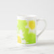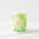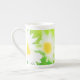 En söt blommigt med ben china mugg med en vit daisy blomma mot en ljus grönt bakgrund.
