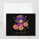 Skicka festive fall hälsning med det här vykortet Dia de los Muertos med en snyggt kvinnligt skelett i en blommigt sombrero, omgiven av vibranta marigets och elegantens skript. Perfekt för Halloween, Day of the dead eller höstfirande. Anpassa med ditt namn eller kort-meddelande.