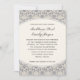 Den klassiska skönheten i ett fuktmönster skapar en elegant ram kring din formulering på den här vintage snöre-inspirerade blommigten. ram är förskönat med en pärlprickad gräns. Den här eleganten har en ljusgrädda färg med grått periwinkle eller dammig lavender-bakgrund. Inbjudans baksida har också mönster. Om du behöver det här utrymmet för mer information kan du ta bort mönster om du vill visa en solid färg-bakgrund.