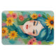 Den här vibrerande och visuella designen har en abstrakt porträtt av en kvinna med tårblått hår med färgade blommor. Hennes serenuttryck framhävs av stängt ögon och rött läppar, ge henne ett drömmande utseende. Att omge henne är vibrerande solblommor, rosa blommar och en massa grönt löv som skapar en lush, trädgårdsliknande atmosfär. Biet har en mjuk, vektor painterly stil, ge det en modern men romantisk känsla. Paletten i färg domineras av tårar, gulter, klämmor och gröntar som skapar en harmonisk och öga-fångstsammansättning.