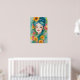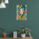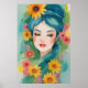 Den här vibrerande och visuella designen har en abstrakt porträtt av en kvinna med tårblått hår med färgade blommor. Hennes serenuttryck framhävs av stängt ögon och rött läppar, ge henne ett drömmande utseende. Att omge henne är vibrerande solblommor, rosa blommar och en massa grönt löv som skapar en lush, trädgårdsliknande atmosfär. Biet har en mjuk, vektor painterly stil, ge det en modern men romantisk känsla. Paletten i färg domineras av tårar, gulter, klämmor och gröntar som skapar en harmonisk och öga-fångstsammansättning.