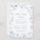 Elegantens kalligrafi och dammig, blå botaniska repetitionsmiddagsinbjudan.