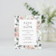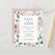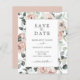 Elegant blommigt budget bröllop spara datum med ett ram som består av vattenfärgsmålat rosor i dammig ro rosa och grönt i sveda grönt. Det här vackra botaniska temat som inte är foto Spara datum ingår i en samling som är underbar för vår eller sommar bröllop.