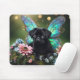 Mousepad med en söt, svart puggvalp med vingar i en logg med blommor
