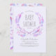 Rustiska skogar och lavender lila vattenfärger, babyduschinbjudan med blommor, fjädrar och hjortar.