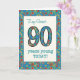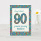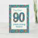 Ett åldersspecifikt födelsedagskort för en 90-årig vän med söt, med nummer 90 och gräns fyllt med ett färgstarkt blommönster på tealbakgrund. Blommönstret är en del av "Granny Print"-samlingen Posh & Painterly, från en handmålad papper kollage av Judy Adamson. Den här designen passar alla storlekar på gratulationskort.