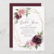 Inbjudan gäster till möhippan med vår burgundi och Blommigt inbjudningskort för möhippa! I elegant inbjudningskort för möhippa finns vackra blommor av typen Faux guld med geometrisk ram, med buketter av blommor av burgundi, mauve och rosa med löv av lush grönt. "Möhippan" i ord visas i ett elegant, ett burgundsskript med duschdetaljer som visas nedan. Baksidan av blommigt möhippa inbjudan har en solid burgundär bakgrund med utrymme för ytterligare text.