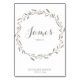 Elegant bröllop placerar kort bord med grått blommigt andedräkt och anpassningsbar grått text tryckt på vit bakgrund