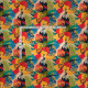 Ett exotiskt blommönster av abstrakt i ljusa skuggor av grönt, guld, blått och rött.