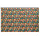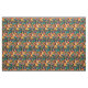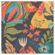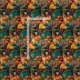 Ett abstrakt färglöst blommönster i nyanser av marinblått, guld, orange och grönt.