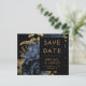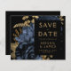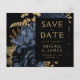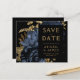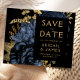 Den här eleganten har det moody bröllop spara datum-kortet en lush, romantisk blommigt bouquet i marinblått med guld faux foil och glitter löv på svart bakgrund. Anpassa guld-färgad-texten i snyggt typsnitt på en svart rektangel och lägg till bröllop webbplats-URL:en till den helsvarta baksidan.