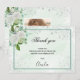 Ett tack till eleganten med foto. Grönt vattenfärgade penseldrag som bakgrund, dekorerade med faux silver glitter damm, vita blommigtar och grönenergi. Anpassa och lägg till tackkortet. Svart text.