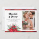 Julkort med gift & God jul Bröllop Photo Blommigt har ett svart elegant skrivet skript "Married & Merry" på en vit bakgrund som accentueras med röda poinsettia-blommor och röd tjära. Personlig med ditt eget meddelande och namn genom att redigera texten i textrutan. Lägg till ditt favoritfoto. Visa andra objekt i den här samlingen som är designade av Evco Helgdagars https://www.zazzle.com/store/evcoholidays