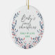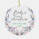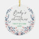 Glatt Minimalistisk Elegant Blommigt Baby Frist jul White Ceramic Ornament, design med blått och rött krans av julblommor, Baby första jultexten och personlig baby namn i grönt färg.