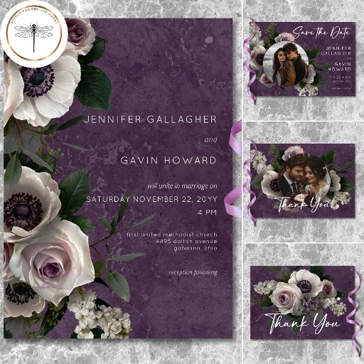 Den här krävande bröllop spara datum-kortsdesignen har en fängslande spray av lavender för blek, vit, grönt och blek, anemoner för rosa och ro, som är elegant placerad mot en luxuriös mörk plommons lila med en mjuk marbleiserad effekt. Den rena, moderna vita typografin tillför en liten elegans och skapar den här designen perfekten för ett romantiskt och sofistikerat bröllop. Skapat av Farmhouse Press.