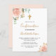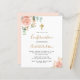 En vit bakgrund som dekorerats med eukalyptus greenery, ro guld och rosa ros, guldlöv. Personalisera och en namn och ceremonidetaljer. Svart och guldfärgad färgad brev. Bakåt: ro guld.