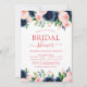 Den marina blåa, vita och Rosan Modern och Elegant Blommigt Watercolor Vår bröllop Inbjudningskort för möhippa - innehåller vacker och elegant manustypografi med moderna botaniska blommor och grön för att den speciella bruden ska vara firande.