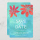 Ett tropiskt-inspirerat Spara datumkortet med blommor av rosa-orange som är inställda på en turkosblå bakgrund i vattenfärg. Lägg till dina uppgifter i en elegant.