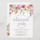 Den här inbjudan från trendig-pension-partiet innehåller söt vattenfärgblommor i mjuka nyanser av rosa, blått, lila och vitt, med löv av grönt och lila och modern typografi i en mjuk pastellblått.