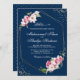 Inbjudan med inbjudan till gästerna i elegant bröllop, som innehåller vackra blommor i rosa med faux guld foil hexagon ram och "Bismillah" i arabisk kalligrafi på marin blå bakgrund. Lägg bara till din händelseinformation i den här mallen som är enkel att använda för att göra den till en inbjudan av typen en. Vänd kortet över för att visa en blå punkt och en guld-punkt mönster på baksidan av kortet.