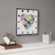 En klocka med ett illustrerat hjärta fyllt med blommor och löv i färger för rosa, grönt och gult.