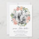 Vår Blommigt i mitten av sommaren sparar datumkortet ramar ditt favoritfoto på förlovningen med en rund utandning av målat vattenfärg ro och peonblommor i mjuka nyanser av rosa, persikor och kräm, accentuerad med grönt, eukalyptus och kalligrafbokstäver för chic. Ett modernt och elegant val för vår eller sommar-bröllop. Anpassa med namn, bröllop-datum, plats och bröllop webbplats med hjälp av fält.