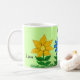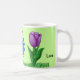 Söt blommigt med guldblomma av gult, blåblomma av gult och lila i gräset av grönt. Kärlek är skrivet i svart skript runt ljust grönt mugg. Söt mugg för att brista upp någons dag. Originalgrafiktverk av TamiraZDesign. www.zazzle.com/tamirazdesigns