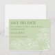Skicka ett påfallande vykort för spara till datum som inte får borttappad i paket med e-post. Blommor som skisseras i vitt står ut mot bakgrund av en grönt. All text är anpassade med din egen information. Baksidan är lämnat tom, förutom för en liten bukett så att du kan lägga till ditt eget personlig-meddelande eller lämna det som adressering. Finns i alternativ färg.