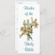Ett vackert kort som är perfekt till använda som bokmärke för din bibel. Framsidan har en blå kor täckt av blommor. Baksidan har bokar av det nya och gamla vittnesmålet.