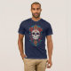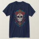 Vibrant sockerskalle fyllda med teal-, rött- och orange-blommigtar; Day of the dead inspirerad, ornerad lina och fet palett för festivalT och gotiska kalvar.